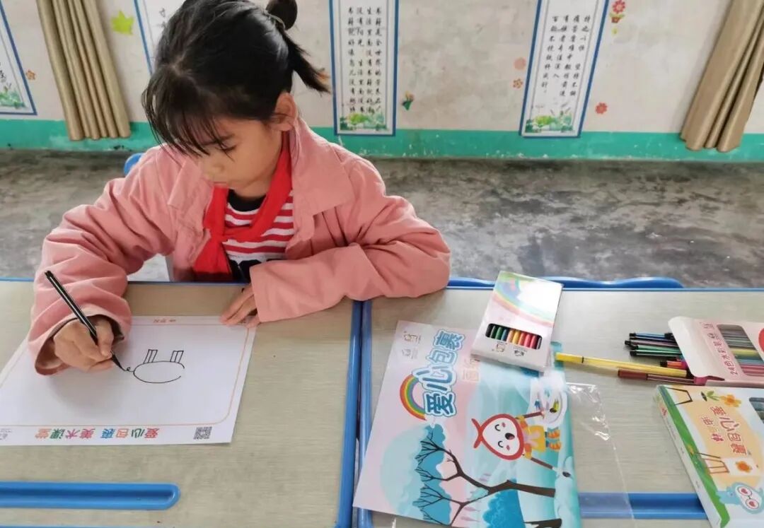 她从老师手中接过爱心包裹后,立刻回到座位打开了包裹。里面的惊喜是她万万想不到的:有彩泥、魔方、贴纸,还有她最喜欢的油画棒、水彩笔!