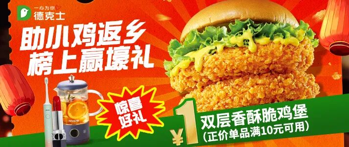 *价格说明:划线价格为“被比较价格”,并非指原价,而是指德克士菜单单品价或菜单单品总价;除非图示另有解释,否则图示如有立省的金额或折扣比例,是与其所含单品的德克士菜单单品价格的总和相比较。