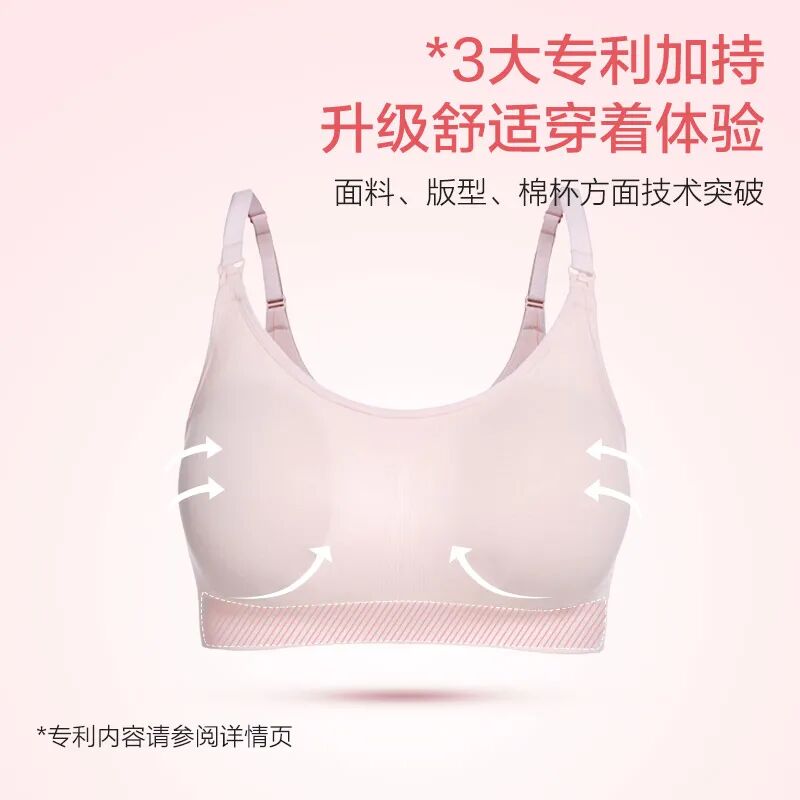 除了内裤,哺乳文胸也是我们投入巨大精力研发、突破行业技术壁垒推出的高含棉量无缝大弹力文胸,版型专为亚洲妈妈体型定制,内嵌婴儿级无毒海绵罩杯,经过上千人体型数据分析、100多位妈妈试穿+12次改版升级,最后达到3项专利技术加持,让这款产品能对孕期和哺乳期敏感妈妈带来非常健康便捷的贴身呵护!