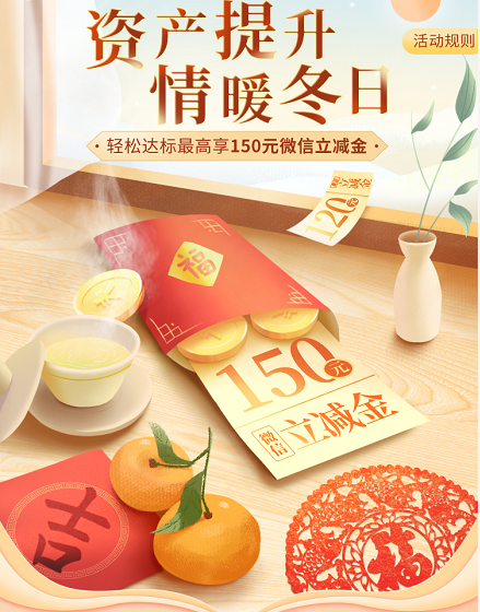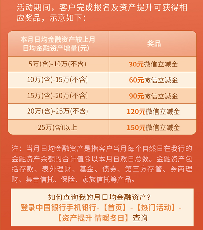 完成活动报名后,当月日均金融资产较上月提升5万元,即有机会获得30元微信立减金,在此基础上当月日均金融资产每再提升5万元,可有机会额外再获得30元微信立减金,微信立减金最高可累计获得150元。