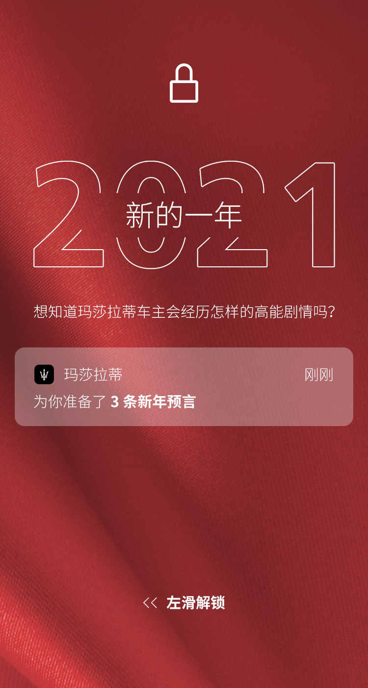 推荐:「左滑」解锁玛莎拉蒂的新年预言,「点击弹出」壁纸大图,吸引大家保存转发,同时,送出新年祝福。