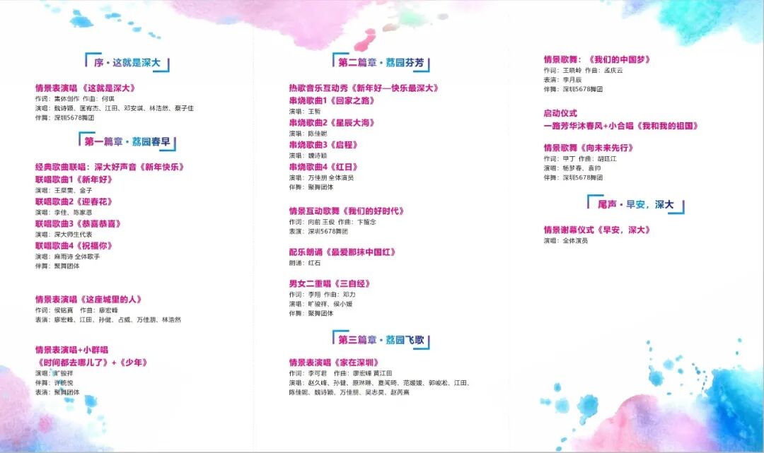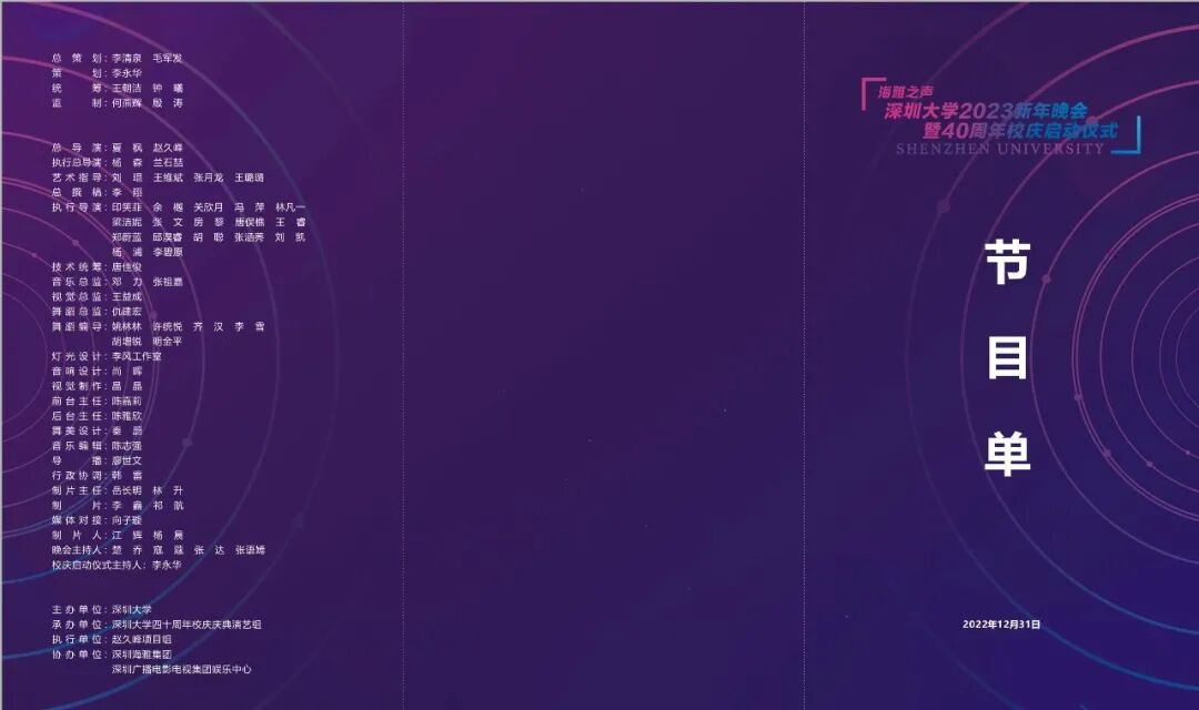 2023年是深圳大学建校四十周年。在辞旧迎新之际,深圳大学通过新年晚会的形式,以音乐的方式,传颂深大精神、展现人文风貌、歌唱时代心声、阐释最美情怀,向为深大40年建设发展披荆斩棘的先辈们致敬,并以最美的歌曲、最真诚的祝福向师生校友、社会各界表达感激之情。