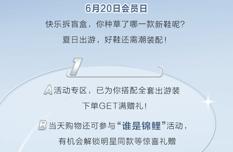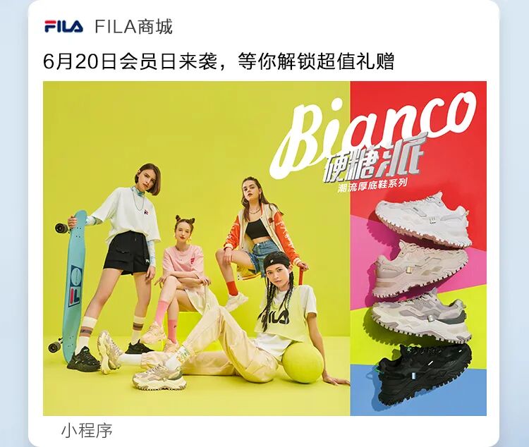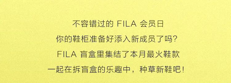 不容错过的 FILA 会员日 你的鞋柜准备好添入新成员了吗?FILA 盲盒里集结了本月最火鞋款 一起在拆盲盒的乐趣中,种草新鞋吧!BIANCO 硬糖鞋 RJV 千禧老爹鞋 JOGGER EHIKE RITMOSTREAM 点击抽取盲盒,内含隐藏款!“潮”能打盲盒 甜美丨温柔丨酷飒丨随性 你是哪一款硬糖派?点击查看你的硬糖风格 外表绚丽,时刻散发迷人气息 内心坚定,永远忠于最真实的自己 你就是天生的“硬糖派” 灵感来自象征坚毅内核的阿尔卑斯山最高峰 “硬气”态度上脚,让每个女孩尽情张扬自我 独有的4.5cm增高专为女性而设计 一秒变身腿精女孩,解锁更多穿搭可能 丰富层次鞋面独具魅力与吸睛感 自信迈步,一脚点亮前卫步伐 全掌搭载 TECNO-PIUMAX 轻能发泡科技 轻量和缓震性出色表现,“硬糖”风格更肆意展现 BIANCO女款专属 复古派盲盒 复古风爱好者赶紧列队 带你解锁潮流复古风尚 点击查看你的复古色彩 欢迎来到千禧年代 RJV 千禧老爹鞋情怀满满 麂皮组合粗旷网布材料 外观尽释高级质感 TECNO-ENERGIA 动能发泡科技与轻量耐磨橡胶 缔造卓越的舒适缓震体验 撞色鞋底呼应炫彩夏日 让你每一步都自带吸睛属性 RJV女款配色 RJV男款配色 乘风破浪盲盒 一双实力与颜值兼具的战靴 助你破浪前行 点击查看职场战靴 穿上 JOGGER E 你就是都市职场的时尚先锋 重塑经典注入全新风格 JOGGER E 就如同职场上不断创新的你 分割层叠的块状鞋面个性时尚 外扩鞋底披露不羁风范 JOGGER E男款专属 女性的职场实力同样不容小觑 秘密武器 HIKE 鞋款,助职场之路走得更稳 迎合女生审美的圆润鞋面 完美匹配日常通勤的百搭需求 捕捉都市户外元素加入设计 尽展不拘一格的摩登态度 粗旷纹路鞋底结合工装风格廓形 上脚抢眼,前卫酷飒 HIKE女款配色 能量满满盲盒 不要停下前行的脚步 唯有运动可以治愈一切障碍 点击查看你的热炼拍档 STREAM 鞋款 为你打造下班后的完美运动之旅 回归极简理念 脚下重量减轻,自在无负担 一体式飞织鞋面 集结舒适包裹性与良好支撑力 TECNO-ENERGIA配方 优秀的能量回馈,让热炼更轻松 STREAM男款配色 外型释放优雅讯号,脚感柔软轻盈 穿上 RITMO 时尚运动鞋,秀出专属女子力 鞋身灵感源于音乐的律动 日常搭配展现出女性柔美一面 运动时刻释放活力动感 层叠厚底造型聚焦视线 气垫般的柔软感,让你如同一脚踩进云朵里 RITMO女款专属 快乐拆盲盒,你种草了哪一款新鞋呢?抢购通道已开启,快前往前往官网探索 别忘了6月20日 FILA会员日上新,还有一大波福利向你涌来 好货太多,选款选累了?喝杯下午茶休息下 1. FILA 请你喝下午茶啦!会员日臻享积分兑限量好券 2. 积分不够换?教你快人一步攒积分 点击进入“赚积分”中心 官网卡片:20号会员日来袭,等你解锁快乐星球 -----------往期回顾----------- 本期话题互动 “你还想抽哪种类型的盲盒?” 点“赞”“在看”“分享” 一键三连