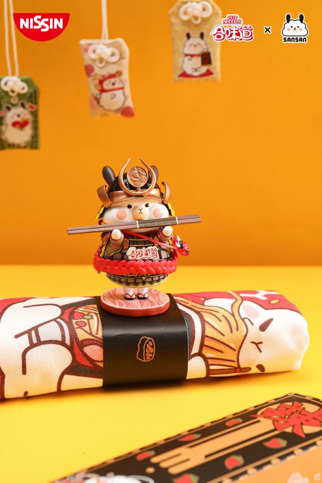 软扑扑的三三头戴镀金色的头盔、身披锃亮的盔甲,手举细腻的雕花筷子,脚踩纯手工绘制的烧肉底座,刚柔相济、可盐可甜——