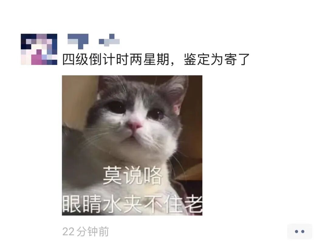 昨天下班回家后,劫宝打开了朋友圈,突然看到了学弟哭诉快要四级考试的动态!