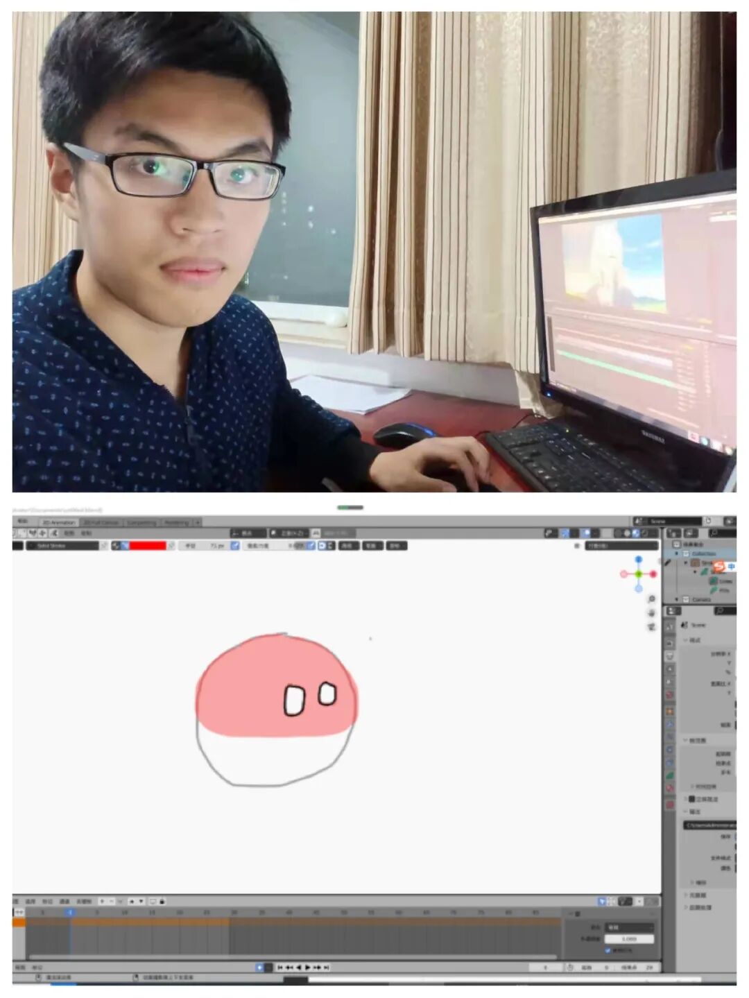 对于在经管院新闻中心任职的刘继远来说,带给学院更多优秀的图片和音视频作品是他的工作,也恰好是他的兴趣所在。利用大学空余时间,他已经熟练掌握了Ps、Pr等多媒体内容制作工具。而这个寒假他向着自己儿时梦想的方向出发去学习——制作动画。迈出第一步总是困难的,面对着陌生的blender动画制作软件的界面他感到手足无措。跟随着网络上的教程,他尝试弄清每一个按键的作用,每一个图标的功能。终于一个三秒钟的小球弹跳的小动画被制作出来。当然这对刘继远来说仅仅是一个开始,今后他将制作更多的优秀动画。对于未来,他总是乐观积极向上地面对:“从事一份我所热爱的工作将会令我无比兴奋和幸福,从尝试中收获知识和感动才是尝试的真正魅力。”