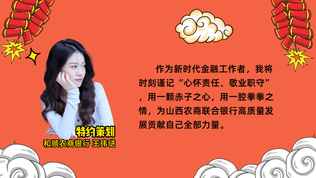 龙行龘龘踏征程,前程朤朤开新局。2024年是山西农商联合银行的起步开局之年,作为一名一线综合柜员,我深感责任重大、使命光荣。我将不断学习好、贯彻好、执行好上级指示精神,从自身出发,苦练“内功”、提升本领,以积极乐观、奋勇拼搏的良好风貌做一个“龙马精神”的农信人,将服务“三农”同自身使命联系起来,将服务群众同自身奉献联系起来,用服务赢得群众,用诚心换取真心,不断提高客户满意度和认同感,为擦亮“百姓银行”金字招牌贡献自己的无穷力量。