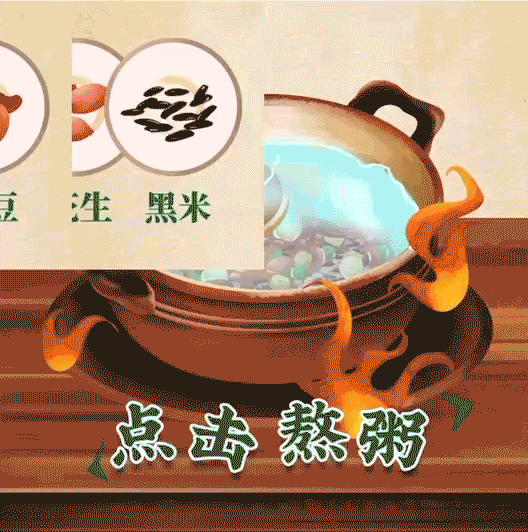 点击熬粥加入花生、黑米、绿豆等粥料,借此宣传本素酸菜鱼,吸引大家互动领鱼券。