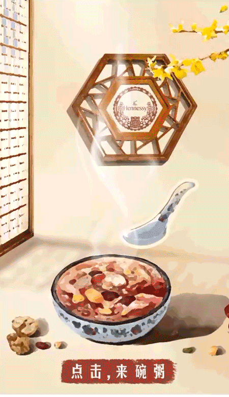 「点击切换GIF动图+展开」查看腊八故事,介绍腊八粥的同时推荐加轩尼诗的美酒。