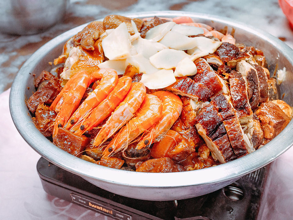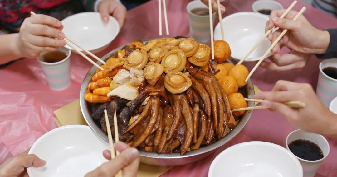 比如盆菜,象征着团团圆圆、丰衣足食,将丰富的食材融合在一个大盆中,然后围坐分享。