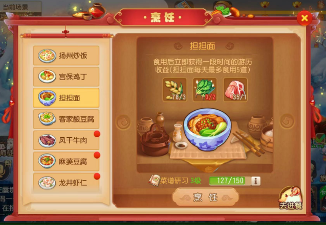 这样一来菜谱等级高,做出高品质担担面的概率也就越大,即可将多余的高品质担担面赠送给队友,达到收益最大化。