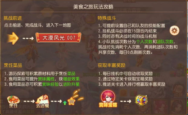 美食之旅为五人组队的放置休闲玩法,简单概括可分为三个环节——“游历”、“学习”、“打怪”。