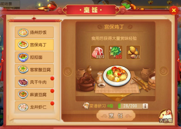 学习:累计菜谱残页可提升烹饪水平,做出品质更高的菜品;通过食用菜品,少侠们可提升属性、领悟被动技能。
