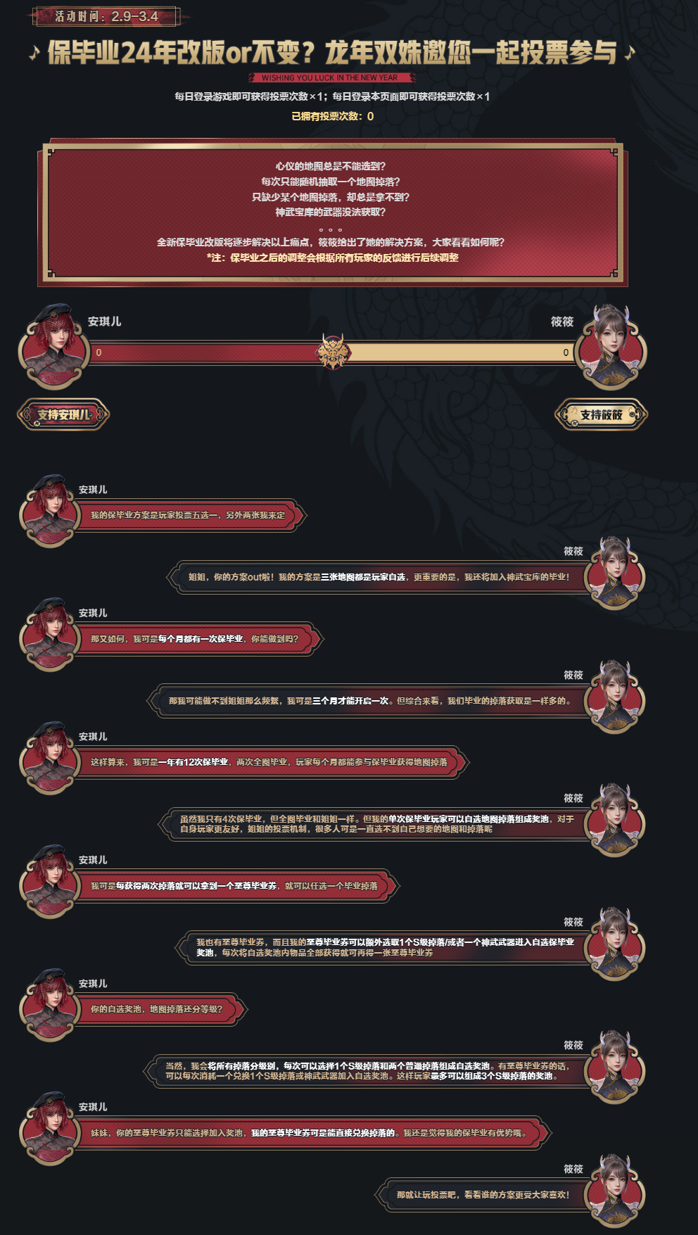 在本次保毕业活动期间,各位NZer每日登录游戏,即可获取投票次数,每日登录活动界面,还可额外获得一次投票机会,究竟是支持安琪儿还是筱筱,就由各位NZer们来决定啦!