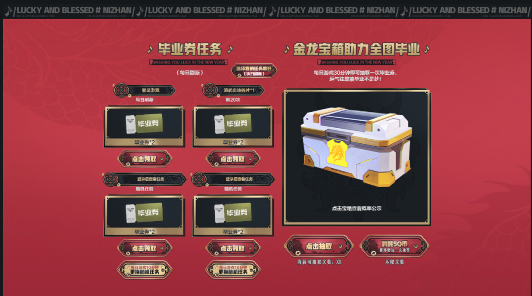 每日游戏30分钟,还可免费开启一次金龙宝箱抽取毕业券,运气王单抽毕业不是梦!
