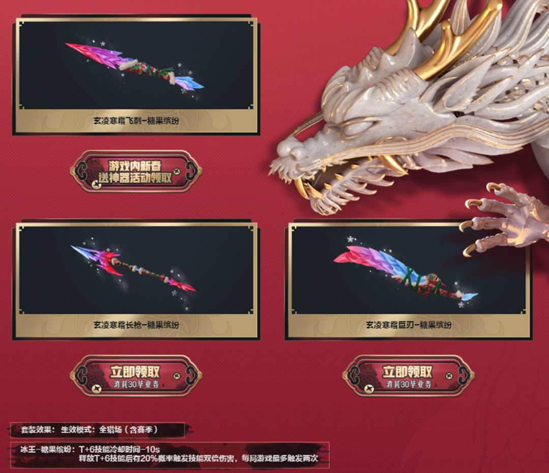 各位NZer在游戏内游玩7天,即可在“新春送神器活动”免费领取玄凌寒霜飞刺-糖果缤纷,而玄凌寒霜长枪-糖果缤纷与玄凌寒霜巨刃-糖果缤纷,则可在本次活动中使用毕业券进行兑换。