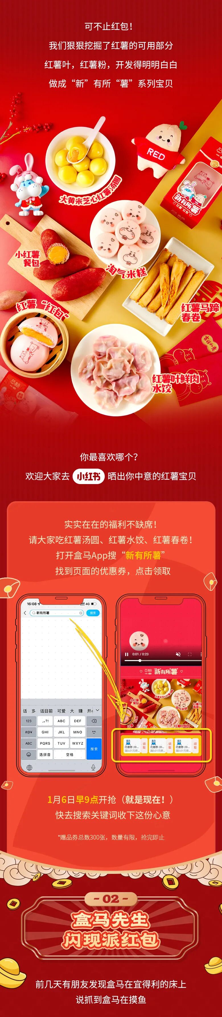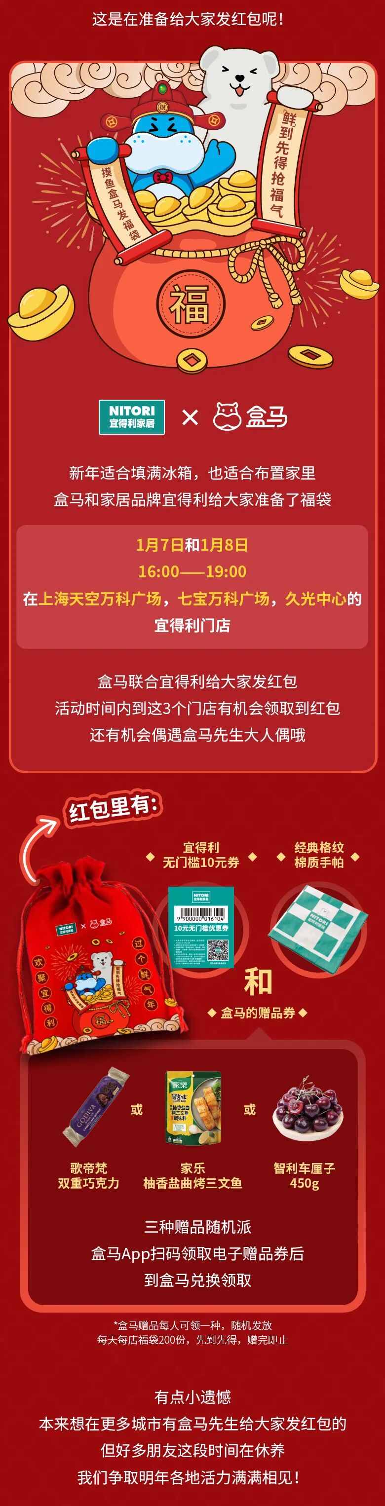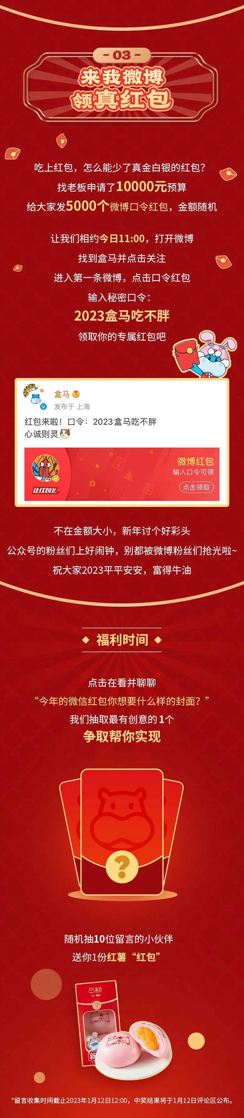 推荐:「点击伸缩式展开」盒马三重红包活动介绍,吸引更多客户前往门店领红包,同时邀请大家留言自己想要的红包封面。