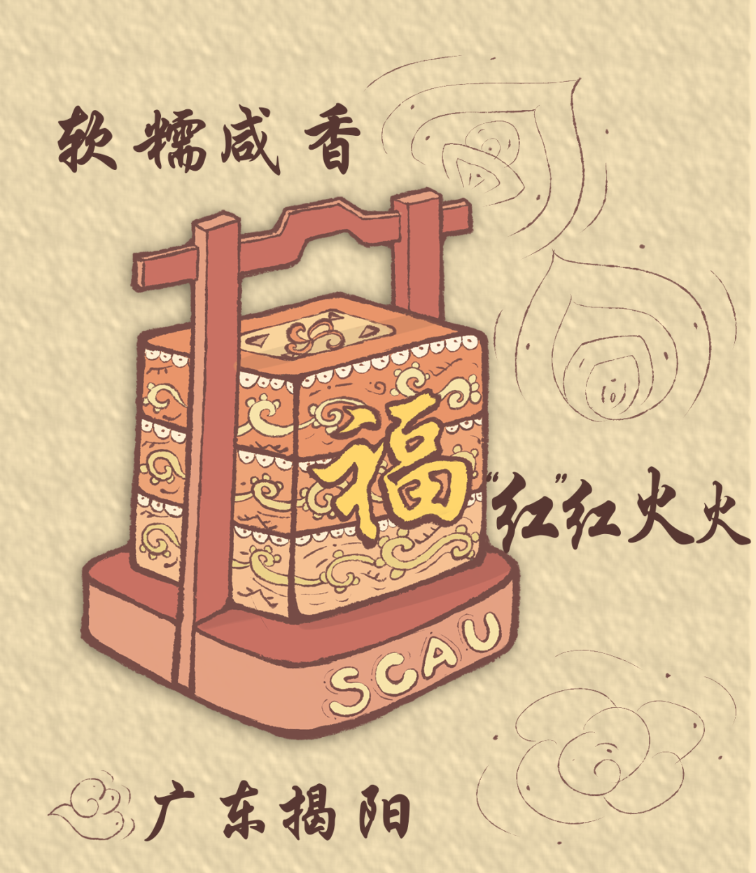 红桃粿是潮汕人年夜饭餐桌上必不可少的特色小食。除夕当天,作为年夜饭的掌勺人,阿嫲总是起得很早,张罗“做粿”。从小,我就喜欢蹲在厨房看她擀面、和面,用高温慢火蒸煮糯米,再把香菇、豌豆、菜脯、虾仁切碎,而后洒上酱料,搅匀、拌成馅儿。捻、搓、压、揉,面团成了圆形的粿,放到潮汕红桃粿的专属印模里压一压,扣出来,一个个形似“蟠桃”的粿就诞生了。或蒸或烙,令人垂涎欲滴。我最喜欢爷爷煎的粿,粉色的粿皮带着点点焦黄,香气扑鼻,一口咬下去,软糯、清甜。蒸鼎烟雾缭绕,潮剧咿呀咿呀,咸香的红桃粿,组成我的幸福除夕。