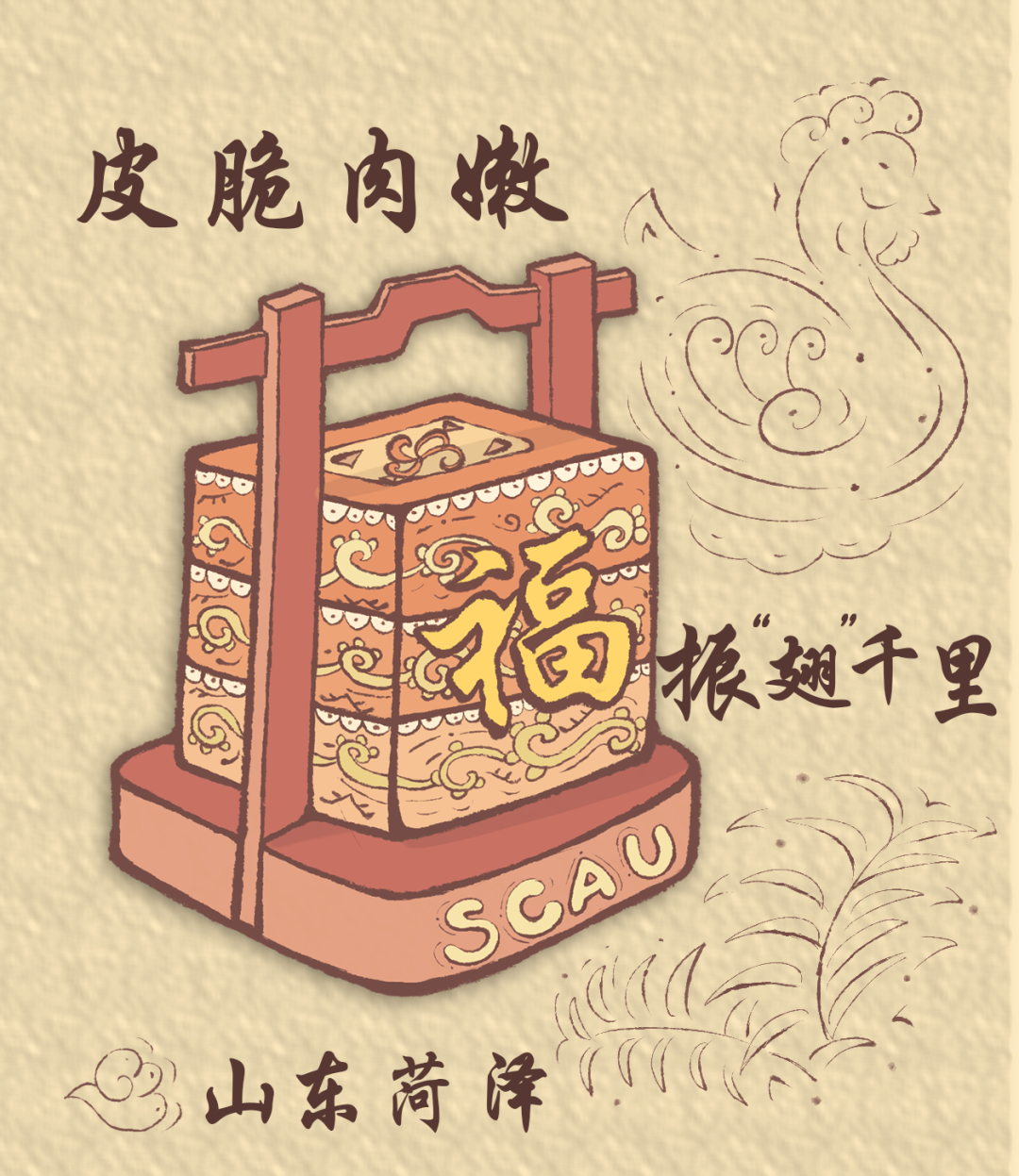 山东烧鸡是鲁菜系中的经典名菜。烧鸡经长时间腌制入味后,再用一定火候进行烘烤,直至外面一层鸡皮咸香软烂,里面的鸡肉丝丝分明,轻轻一咬,便能感受到骨肉在唇齿间脱离。每年的除夕夜,大家围坐在一起看春晚,吃着香喷喷的烧鸡,饮茶畅聊,其乐融融。这些都构成了我在家乡独一无二的春节记忆。