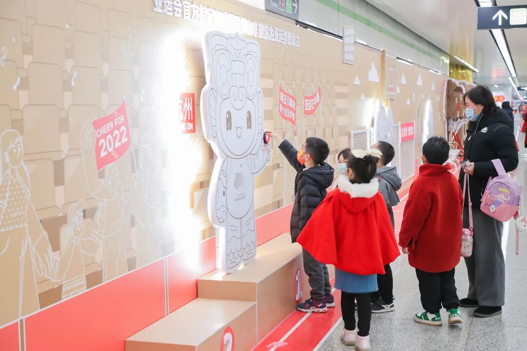 在心愿墙前,和亚运吉祥物琮琮握个手,点亮心愿墙的一瞬间,也点亮充满希望的新一年。