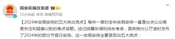 国家发展改革委官方微博就此发布中国宏观经济研究院研究员邢伟的解读文章《2024年放假安排的五大突出亮点》: