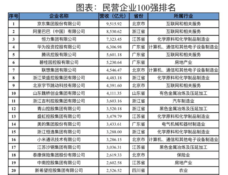 前十强民营企业入围门槛约为4100亿元,以互联网、先进制造为代表。其中以京东、阿里巴巴、腾讯、字节跳动为代表的互联网企业占据4席,京东商业模式以自营为主,其销售额大部分计为收入,以9515.9亿元的营收位居第一,2022年营收破万亿。以恒力集团、荣盛为代表的化学原料和化学制品制造业占据2席。以华为、联想为代表的计算机、通信、电子设备先进制造业占据2席,以碧桂园为代表的房企占据1席,以山东魏桥为代表的有色金属冶炼及压延加工业占据1席。