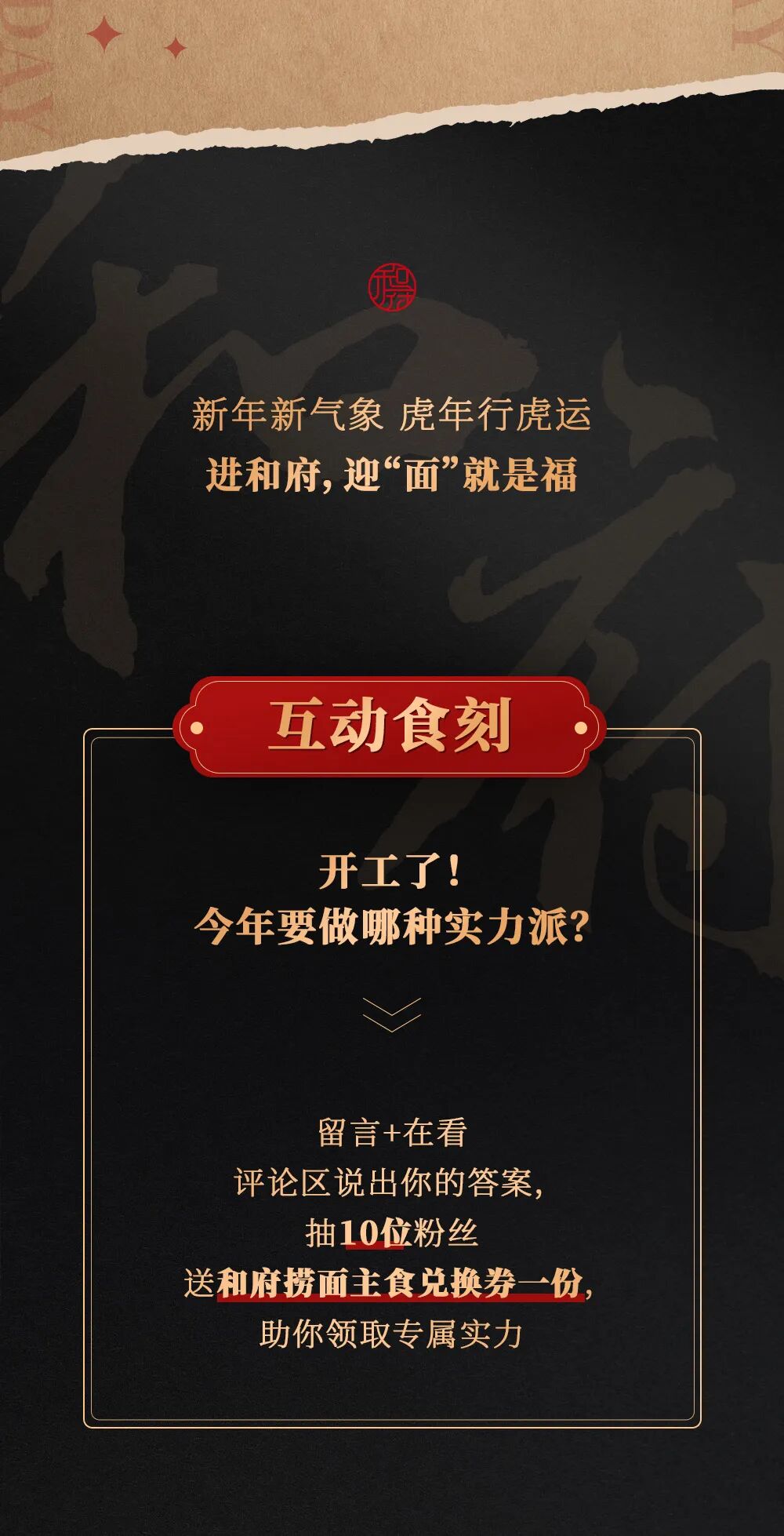 推荐:在虎年开工日,和府捞面通过引导大家左滑查看推荐菜品和祝福语,借此宣传和府捞面品牌。