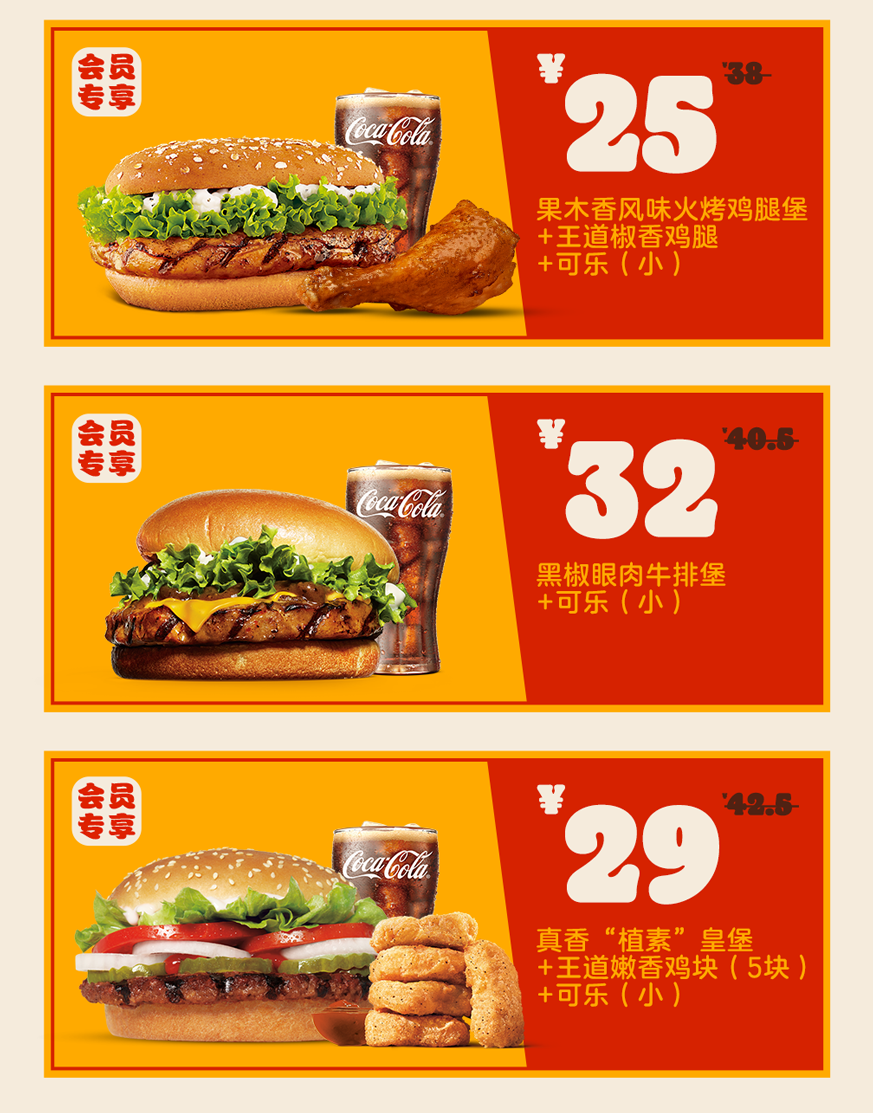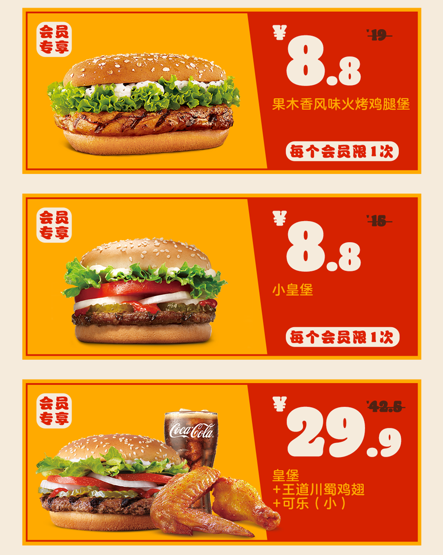 *非外卖渠道价格解释:图示如有划线价格,并非指原价,而是指不参加优惠活动情况下该产品在汉堡王指定门店销售的常规价格(或者指其中所含单品的常规单买价总和)。除非图示另有解释,否则图示如有节省的金额或折扣比例,是与不参加优惠活动情况下在汉堡王指定门店单独购买该产品的常规价格(或者其中所含单品的常规单买价总和)相比较。若需要查询当前门店销售的常规价格,可查看相应门店菜单或详询店员。