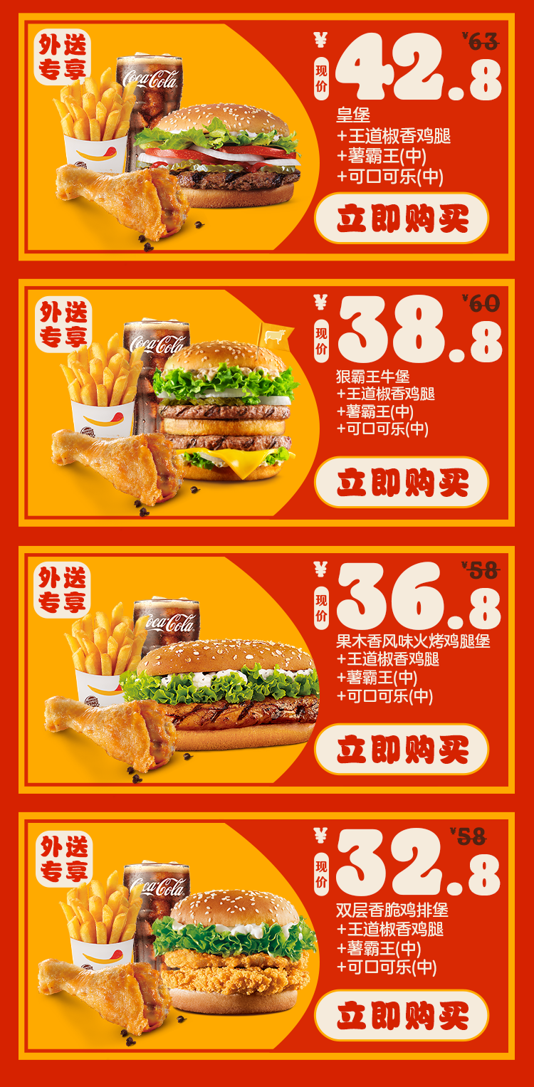 *外卖渠道价格解释:图示如有划线价格,并非指原价,而是指不参加优惠活动情况下该产品在汉堡王外送销售的常规价格(或者指其中所含单品的常规单买价总和)。除非图示另有解释,否则图示如有节省的金额或折扣比例,是与不参加优惠活动情况下在汉堡王外送单独购买该产品的常规价格(或者其中所含单品的常规单买价总和)相比较。