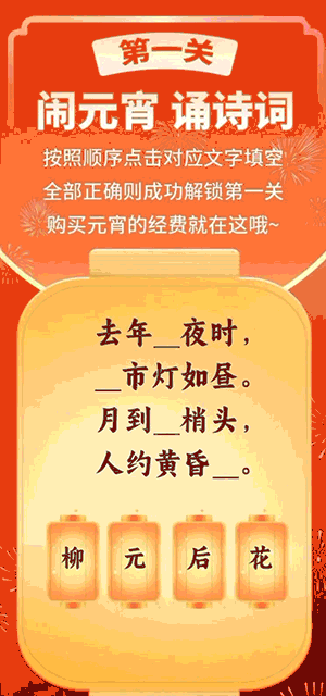 元宵佳节之际,长安银行信用卡通过结合「点击切换」模拟输入诗词、「长按切换」模拟吃元宵、「连续点击切换」模拟找元宵等闯关游戏,带大家玩起来并吸引大家领取福利。
