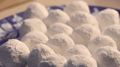 在北京稻香村特有的专利摇锅中,方方正正的馅料,沾了糯米粉浆被扔进摇锅里使劲的摇晃。用尽极大的力气和耐性使得馅料被一层层粉子包裹起来。