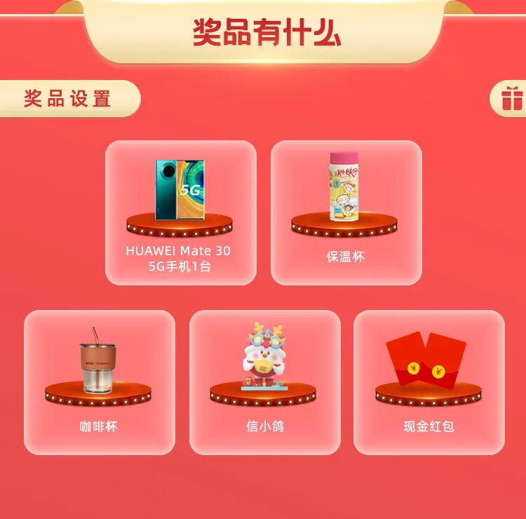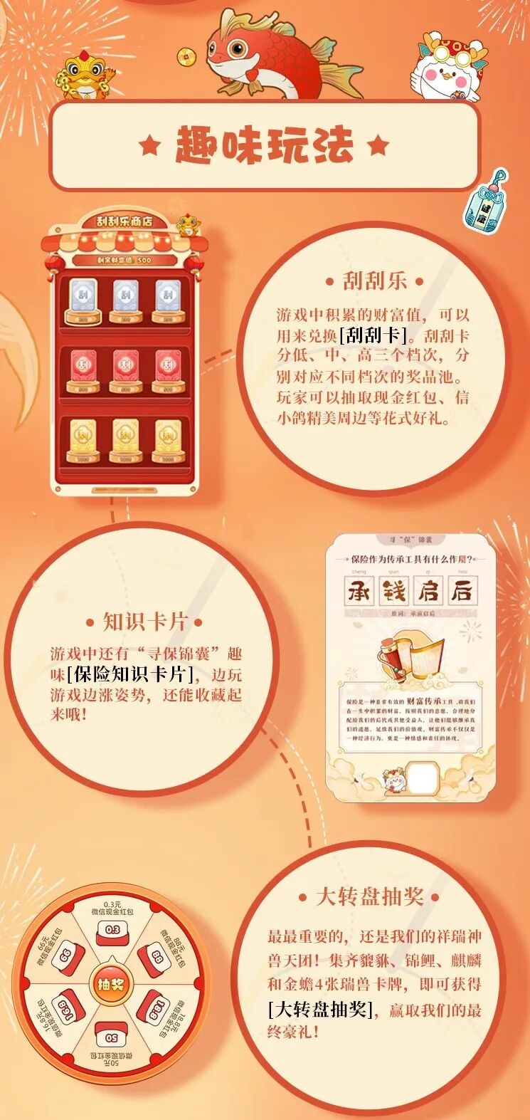 参加游戏,获取财富值,选择刮刮卡进行抽奖,奖池丰富:现金红包、信小鸽保温杯、信me咖啡杯、瑞兽卡以及寻“保”锦囊!