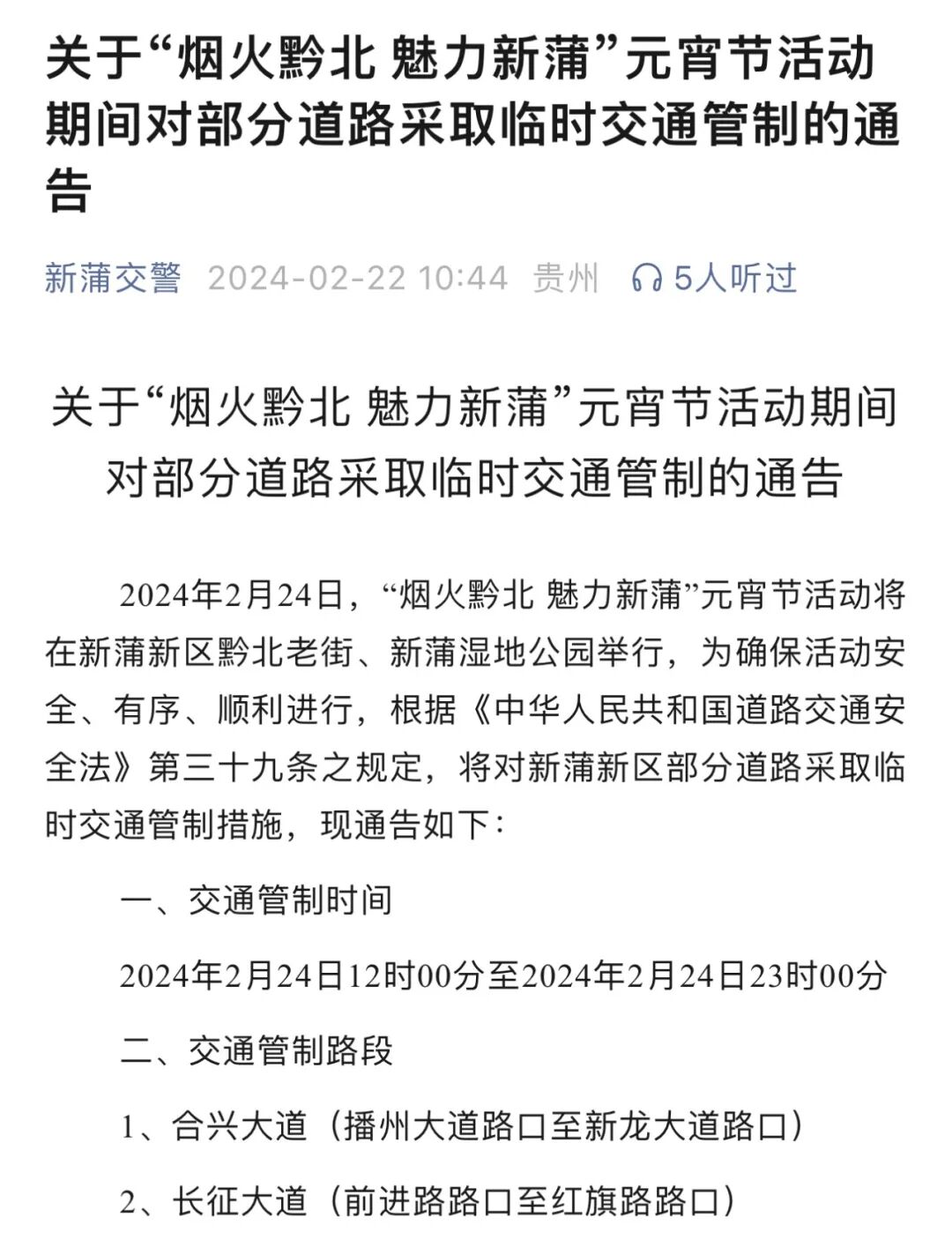 为保障辖区广大人民群众欢度元宵佳节,安全有序参加活动,确保道路交通秩序良好,新蒲交警联合多家媒体提前发布《关于“烟火黔北·魅力新蒲”元宵节活动期间对部分道路采取临时交通管制的通告》,就元宵节当天交通管制路线及相关要求进行了详细通告及说明。