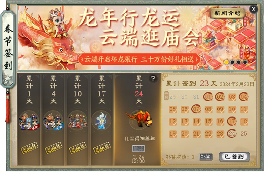 龙年签到活动也将于明日(2月24日)开启终极大奖,符合条件的老铁,可要提前上线准备参与抽奖哦,珍稀神兽年在等着你!