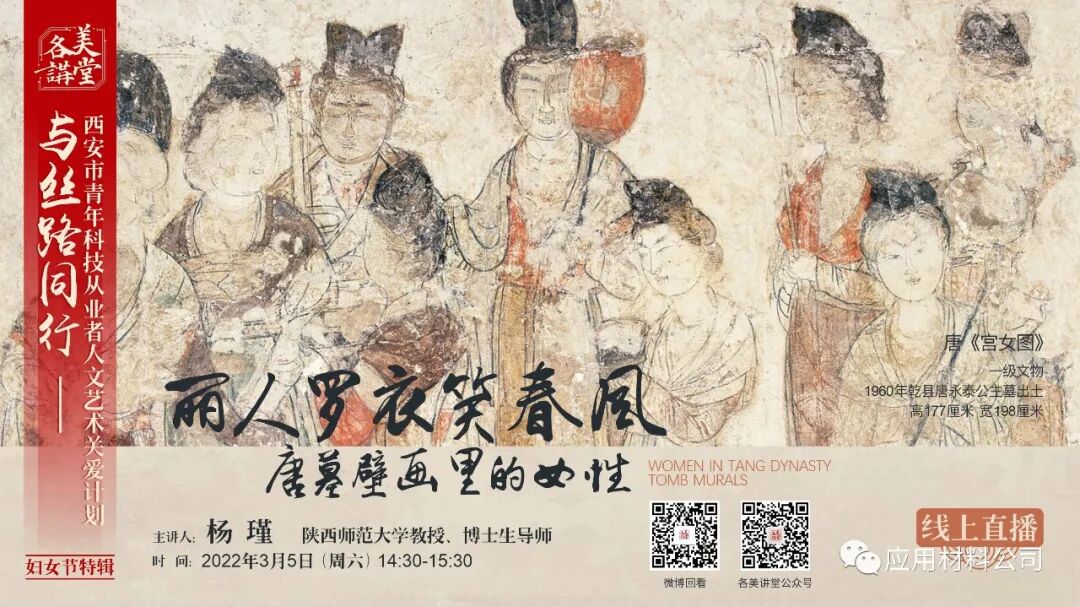 3月5日,应用材料中国公司艺术文化系列公益讲座——各美讲堂推出了妇女节特辑,并以《丽人罗衣笑春风——唐墓壁画里的女性》为讲座主题,邀请著名隋唐史专家、陕西师范大学杨瑾教授为线上观众讲述墓室女性图像,为大家解读了唐朝女性文化,展示当时社会风貌和人文精神。