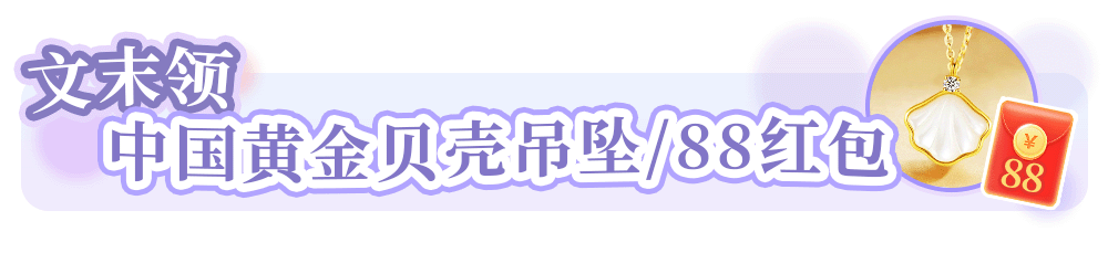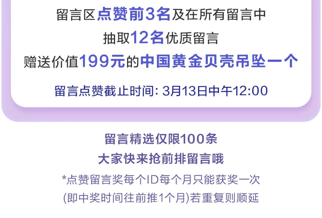 ✔ 参与留言话题,留言点赞前3名即可获得中国黄金贝壳吊坠,同时在所有留言中抽取12名用心评论者加送中国黄金贝壳吊坠!