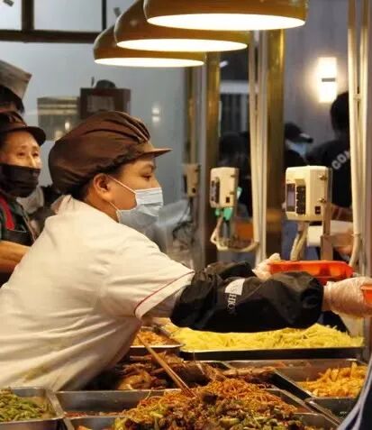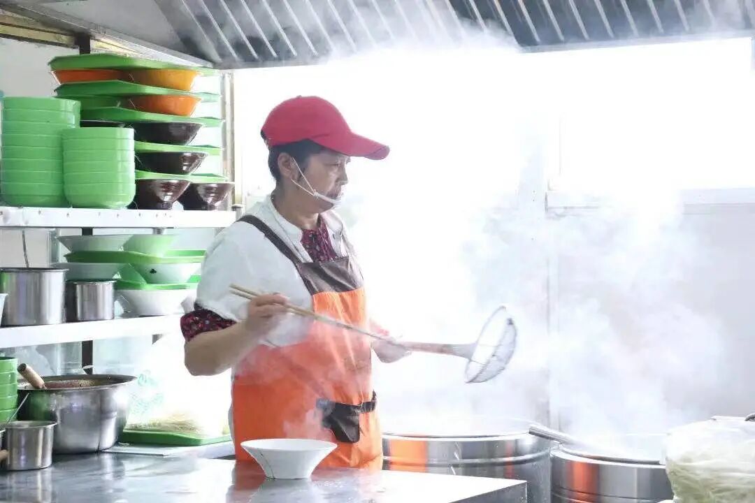 食堂灶炉前烹制菜肴