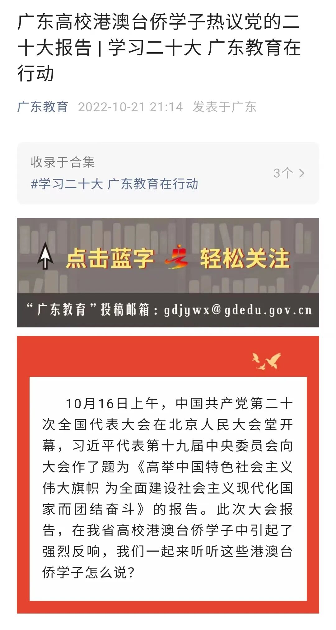 10月21日,广东省教育厅官方微信公众号“广东教育”的《广东高校港澳台侨学子热议党的二十大报告 | 学习二十大 广东教育在行动》报道了2名中山大学港澳台侨学子。
