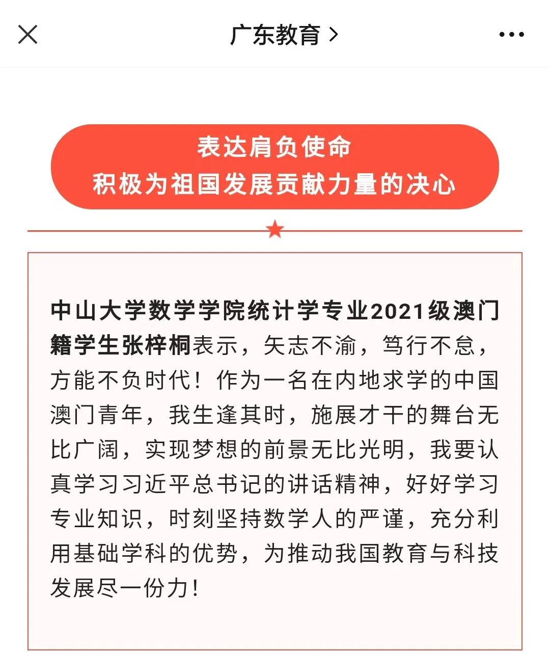 中山大学数学学院统计学专业2021级澳门籍学生张梓桐表示,矢志不渝,笃行不怠,方能不负时代!作为一名在内地求学的中国澳门青年,我生逢其时,施展才干的舞台无比广阔,实现梦想的前景无比光明,我要认真学习习近平总书记的讲话精神,好好学习专业知识,时刻坚持数学人的严谨,充分利用基础学科的优势,为推动我国教育与科技发展尽一份力!
