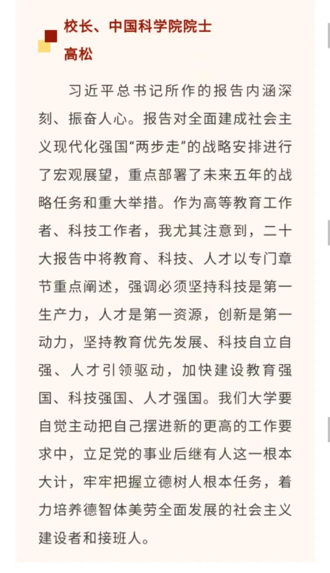 习近平总书记所作的报告内涵深刻、振奋人心。报告对全面建成社会主义现代化强国“两步走”的战略安排进行了宏观展望,重点部署了未来五年的战略任务和重大举措。作为高等教育工作者、科技工作者,我尤其注意到,二十大报告中将教育、科技、人才以专门章节重点阐述,强调必须坚持科技是第一生产力,人才是第一资源,创新是第一动力,坚持教育优先发展、科技自立自强、人才引领驱动,加快建设教育强国、科技强国、人才强国。我们大学要自觉主动把自己摆进新的更高的工作要求中,立足党的事业后继有人这一根本大计,牢牢把握立德树人根本任务,着力培养德智体美劳全面发展的社会主义建设者和接班人。