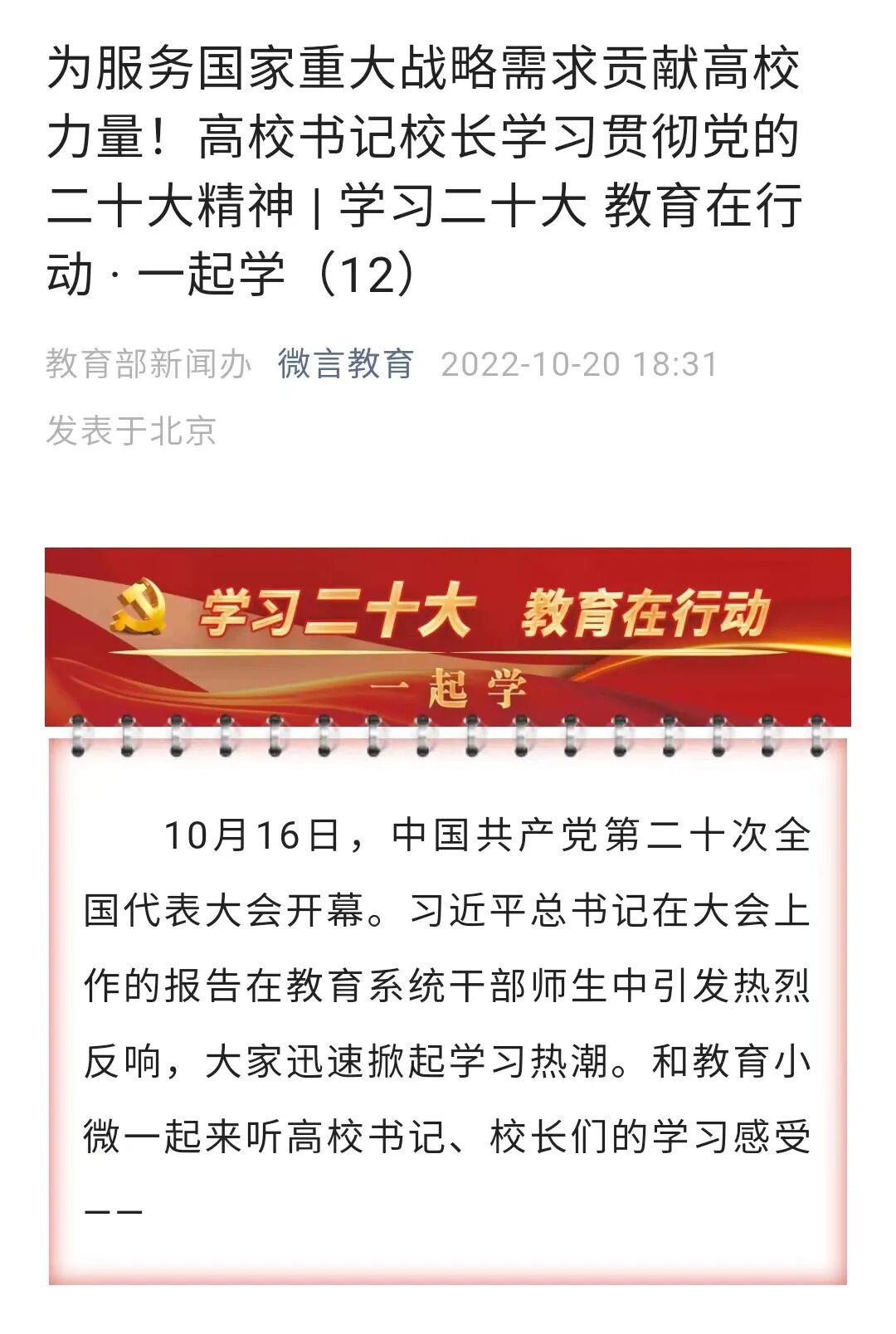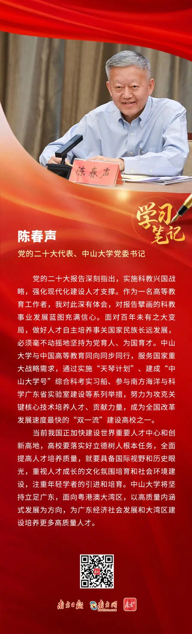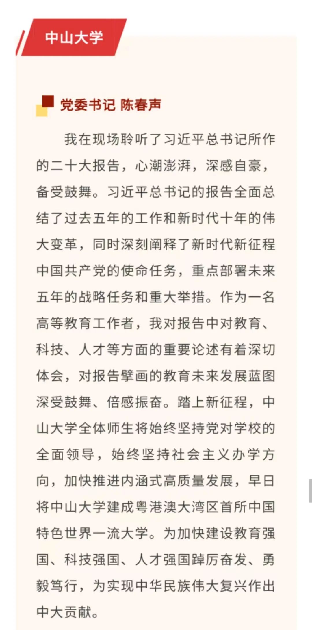 10月20日,教育部官方微信公众号“微言教育”的《为服务国家重大战略需求贡献高校力量!高校书记校长学习贯彻党的二十大精神 | 学习二十大 教育在行动 · 一起学(12)》报道了党的二十大代表、中山大学党委书记陈春声,中山大学校长、中国科学院院士高松。