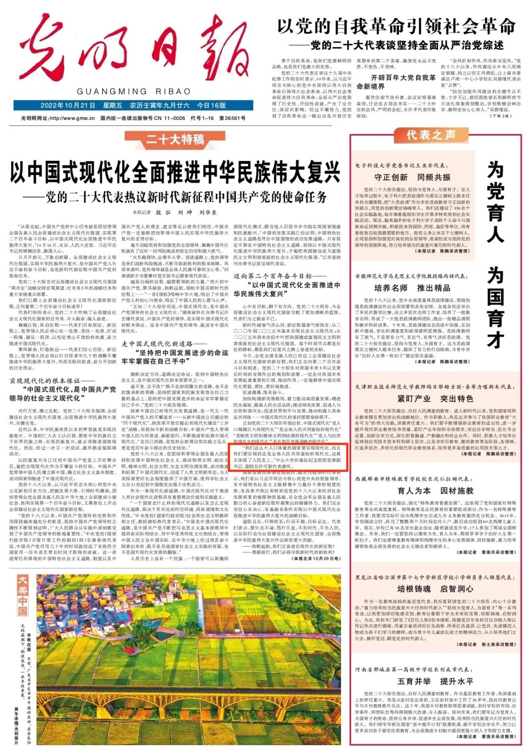 10月21日,光明日报01版《以中国式现代化全面推进中华民族伟大复兴——党的二十大代表热议新时代新征程中国共产党的使命任务》报道了党的二十大代表、中山大学研究生院副院长、中山大学孙逸仙纪念医院党委副书记、副院长许可慰。