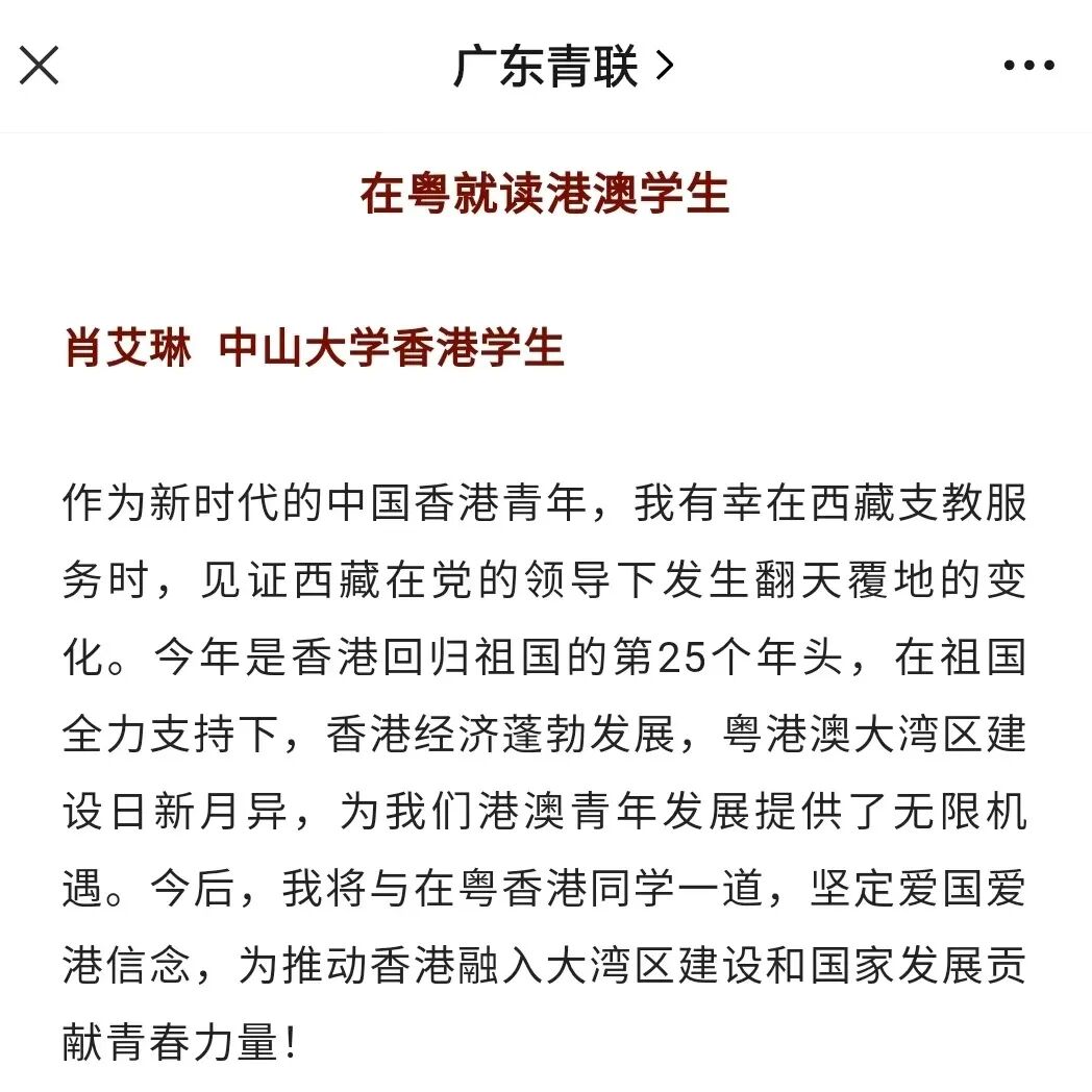 作为新时代的中国香港青年,我有幸在西藏支教服务时,见证西藏在党的领导下发生翻天覆地的变化。今年是香港回归祖国的第25个年头,在祖国全力支持下,香港经济蓬勃发展,粤港澳大湾区建设日新月异,为我们港澳青年发展提供了无限机遇。今后,我将与在粤香港同学一道,坚定爱国爱港信念,为推动香港融入大湾区建设和国家发展贡献青春力量!