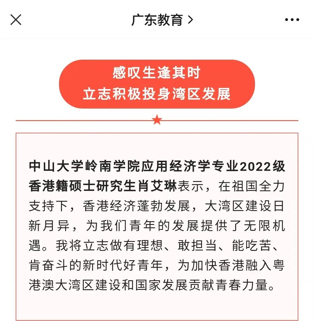 中山大学岭南学院应用经济学专业2022级香港籍硕士研究生肖艾琳表示,在祖国全力支持下,香港经济蓬勃发展,大湾区建设日新月异,为我们青年的发展提供了无限机遇。我将立志做有理想、敢担当、能吃苦、肯奋斗的新时代好青年,为加快香港融入粤港澳大湾区建设和国家发展贡献青春力量。