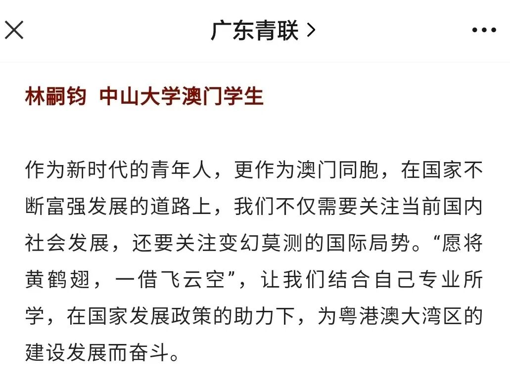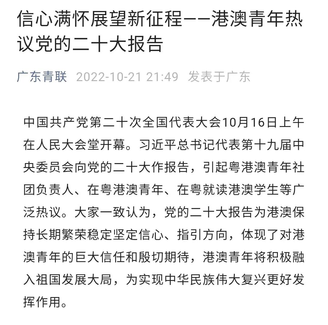 10月21日,广东省青年联合会微信公众号“广东青联”的《信心满怀展望新征程——港澳青年热议党的二十大报告》报道了3名在中山大学就读的港澳学生。