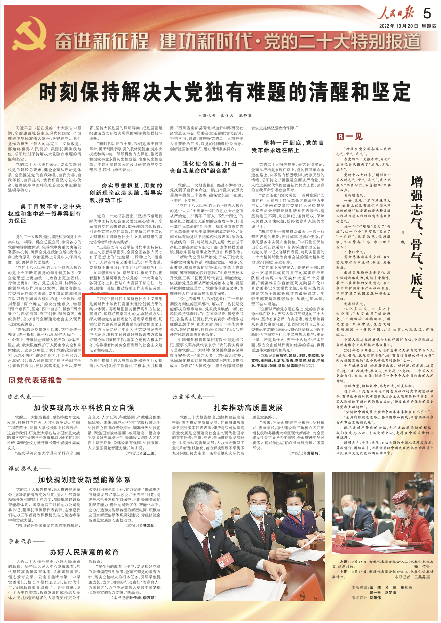 10月20日,人民日报05版《时刻保持解决大党独有难题的清醒和坚定》报道了党的二十大代表、中山大学党委书记陈春声。