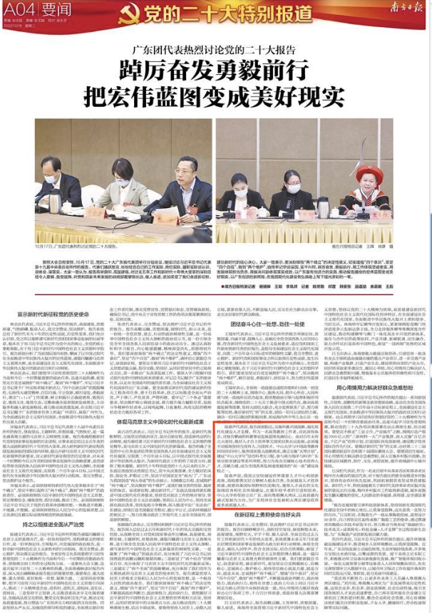 10月18日,南方日报A04版《广东团代表热烈讨论党的二十大报告踔厉奋发勇毅前行 把宏伟蓝图变成美好现实》报道了党的二十大代表、中山大学党委书记陈春声。