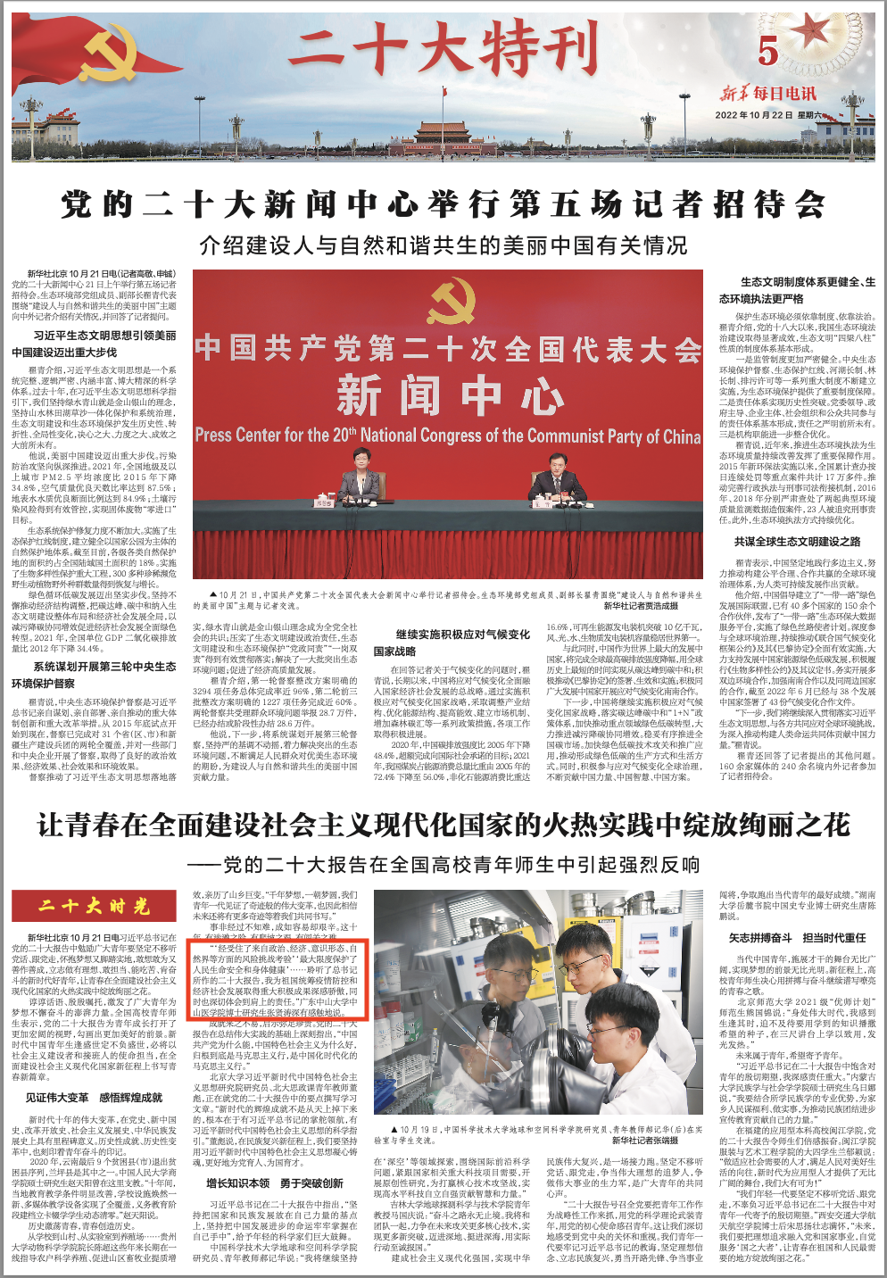 10月22日,新华社播发《让青春在全面建设社会主义现代化国家的火热实践中绽放绚丽之花——党的二十大报告在全国高校青年师生中引起强烈反响》报道了中山大学中山医学院博士研究生张贤涛。