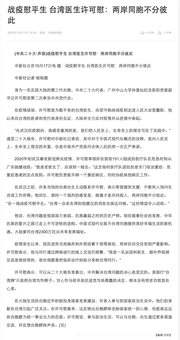 10月17日,中国新闻社《战疫慰平生 台湾医生许可慰:两岸同胞不分彼此》报道了党的二十大代表、中山大学研究生院副院长、中山大学孙逸仙纪念医院党委副书记、副院长许可慰。