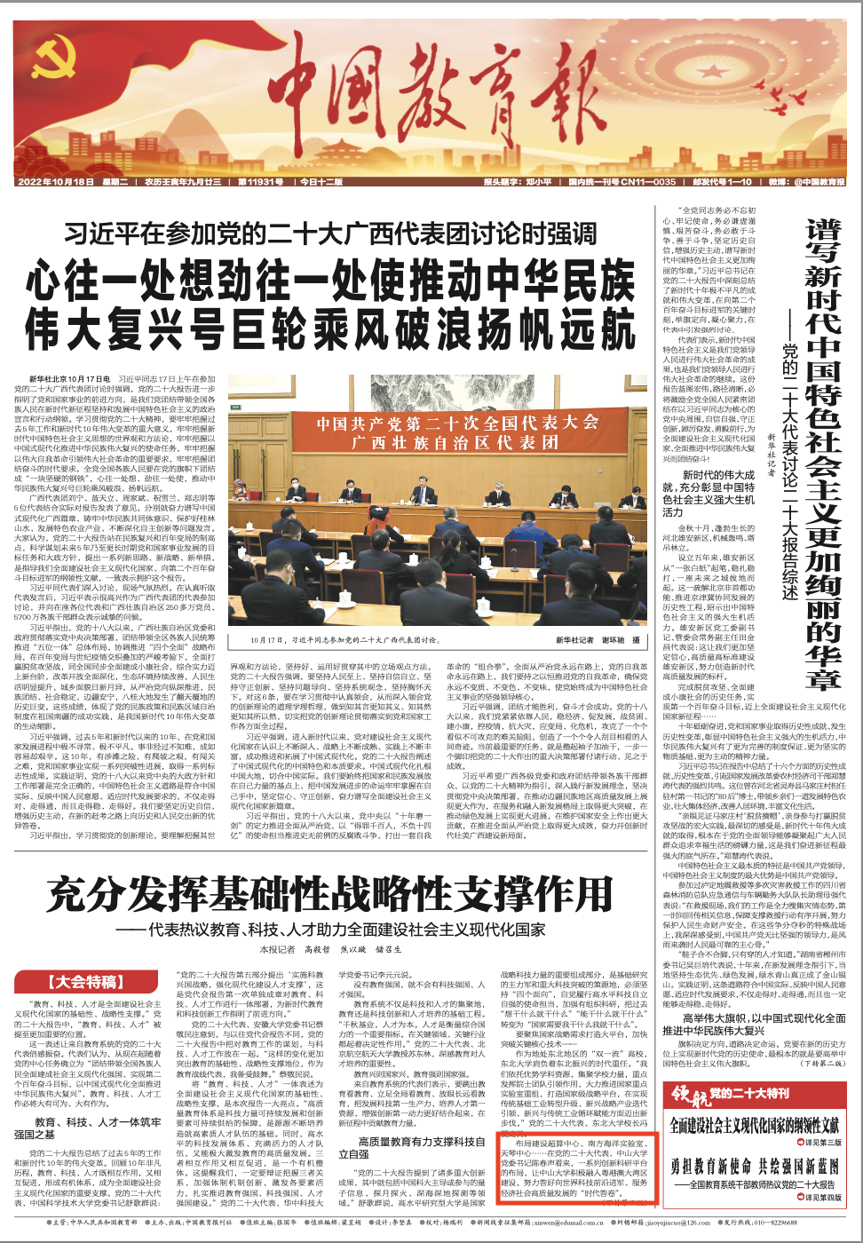 10月18日,中国教育报01版《充分发挥基础性战略性支撑作用——代表热议教育、科技、人才助力全面建设社会主义现代化国家》报道了党的二十大代表、中山大学党委书记陈春声。